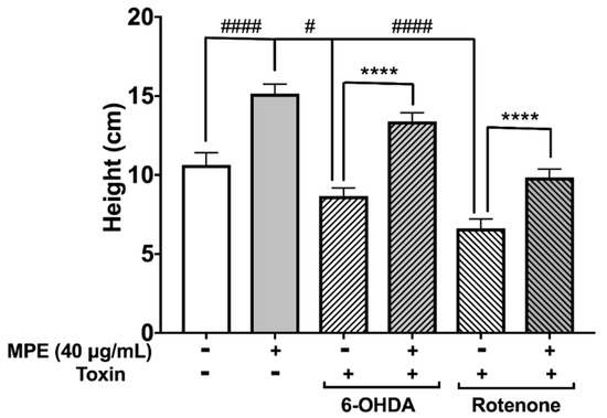 Effects of MPE on negative geotaxis in Drosophila melanogaster. Effects of MPE (40 μg/mL) alone on climbing ability, by MPE after 6-OHDA (1 mM) exposure, and on MPE climbing ability after rotenone exposure (500 μM). Significance was determined as compared with control and p ≤ 0.05 (#) and p ≤ 0.0001 (####); compared with toxic treatment using Welch’s t-test with three replicates of n > 40, p ≤ 0.0001 (****).