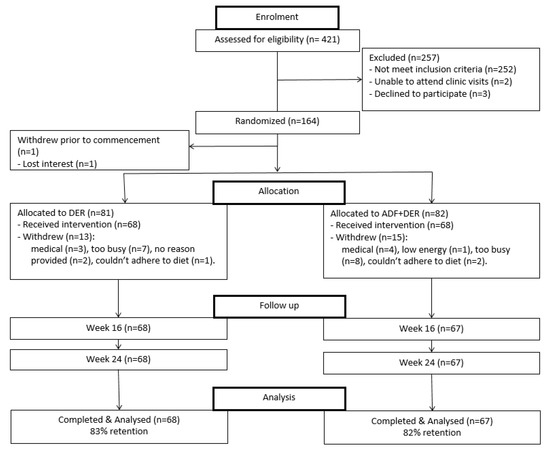 Figure 1. CONSORT diagram indicating sample size at each stage of the study. DER, standard meal replacement program; ADF + DER modified meal replacement program.