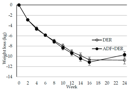 Figure 2 shows the trajectory of weight loss over the 24 weeks by dietary intervention. Results from the mixed models indicated a significant reduction in body weight over time (p < 0.001) with no significant weight change between weeks 16 to 24. At week 16, weight change from baseline was −10.7 ± 0.5 kg in the ADF + DER group and −11.2 ± 0.6 kg in the DER group (Table 3). There was no significant treatment or time by treatment interaction for body weight.