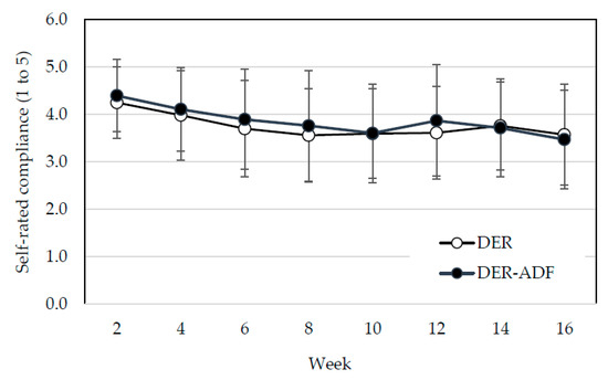 Figure 3. Self-rated compliance (out of five stars) to dietary program for DER and ADF + DER groups. DER, standard meal replacement program; ADF + DER modified meal replacement program. For between-group differences, p > 0.05; for time effect, falls in compliance were significant between week 2 and all other visits (p < 0.05 to p < 0.001) for both groups; for group differences over time (time × diet interaction) p > 0.05, using linear mixed-effects model analysis.