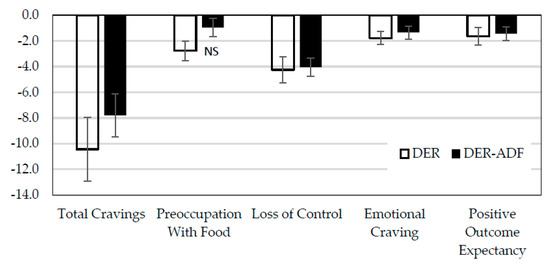 There were significant decreases in total craving level, and for subscales of loss of control, emotional cravings and positive outcome expectancies (all p < 0.001) at week 16 compared to baseline, independent of treatment. There was a significant interaction effect for preoccupation with food (p < 0.05). Post-hoc analyses revealed that the change in this outcome was only significant for those in the DER group (Figure 4).