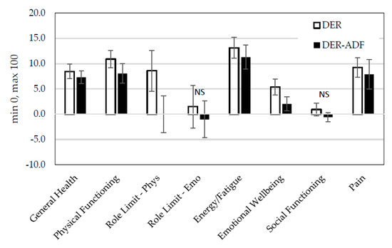 Figure 5. Changes in health-related quality of life scores (MOS SF36) between baseline and week 16 presented by treatment. DER, (n = 68) standard meal replacement program; ADF + DER (n = 67) modified meal replacement program; Phys, Physical; Emo, Emotional; NS, not significant. Note: Scores out of a possible 100 with higher scores representing improved health-related quality of life. For between-group differences, p > 0.05; for time effect improvements in general health, physical functioning, energy, emotional wellbeing, pain p < 0.0001; an interaction effect revealed an improvement in role limitations due to physical function only for the DER group (p < 0.05), using linear mixed-effects model analysis.