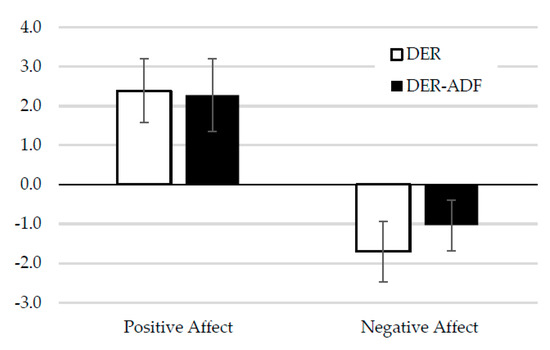 Figure 6. Changes in mood (positive and negative affect) presented by dietary allocation. Note: Scores based on the Positive and Negative Affect Schedule with a range from 10 to 50 with higher scores representing higher levels of positive or negative emotions. DER, (n = 68) standard meal replacement program; ADF + DER (n = 67) modified meal replacement program. For between-group differences, p > 0.05; for time effect p < 0.01 for decrease in negative affect and p < 0.001 for increase in positive affect; the interaction effect was p > 0.05, using linear mixed-effects model analysis.