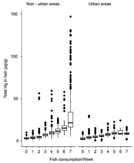 The relationship between maternal Hg levels and frequency of fish consumption in urban and non-urban areas. Box plot charts comparing the weekly fish meals with the total hair-Hg concentrations of urban and non-urban mothers (Tukey test: p < 0.0001).