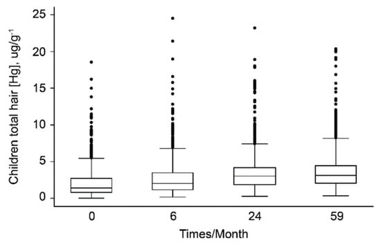 Hg levels in the hair samples of children over time (Friedman’s χ2 = 2270.3; p < 0.0001).