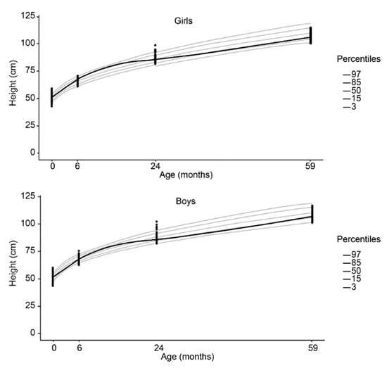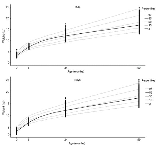 The promotion of adequate child growth is considered a global priority, especially in vulnerable populations. Evidence suggests that from conception to early life, good nutrition and a healthy environment can influence optimal growth, as well as ensure gains in human capital and long-term health []. Therefore, early life is a critical phase of human development that is particularly sensitive to environmentally caused pathologies and nutritional stimuli that may influence health outcomes later in life [].