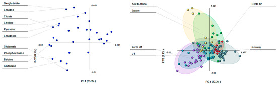 Partial Least Square Discriminant Analysis (PLS-DA) loading plot (left) and scatterplot (right) of human milk metabolites from 109 women in various countries. The score plot shows separation based on maternal country of origin (purple: Perth #1, atopic mothers; red: Perth #2, non-atopic mothers; green: Japan; aqua: US; dark green: Norway; and yellow: South Africa). The loading plot shows the milk metabolites that influence the separation based on maternal country of origin.