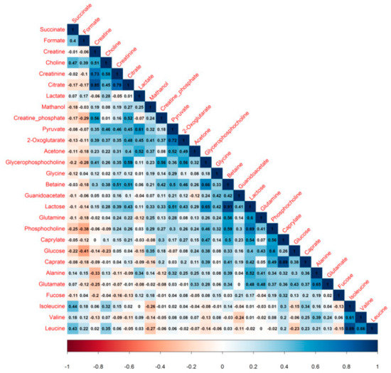 Correlation plot of 28 human milk metabolites from non-atopic mothers. Values shows Pearson correlation coefficients between pairs of metabolites. Positive correlation, zero correlation and negative correlation are represented by colors ranging from blue to white to red, respectively.