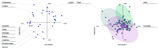 Metabolite variation by ethnicity in the PLS plots was similar to country differences, showing three clusters of milk composition: Black, Caucasian and Asian (Figure 4). Milk lactate differentiated the Asian population from the rest. 2-Oxoglutarate and creatine were the main drivers of the milk cluster in the Black population, whereas the main milk metabolites in the Caucasian cluster were glutamate, glutamine, glucose, and phosphocholine.