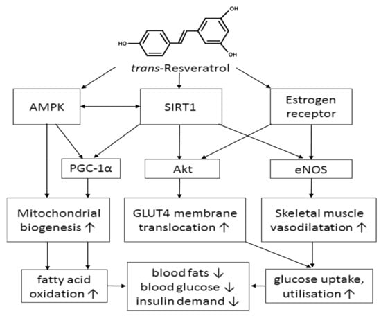 Since its discovery, resveratrol has been shown to exert multifaceted effects on mitochondrial function, bone metabolism, cancer and neurodegenerative disease [28,29], the most consistent being its activation of sirtuins, which may also increase lifespan [30]. The activation of SIRT1 by resveratrol, resulting in increased in AMP-activated protein kinase (AMPK) activity, is thought to be a panacea for preventing age-induced diseases, including diabetes [25,31]. AMPK is expressed in various tissues, e.g., brain, liver, skeletal muscle and adipocytes [32]. Skeletal muscle is a major site for glucose uptake and glycogen synthesis (~80%) [33]. The postprandial elevation of blood glucose triggers insulin release, which suppresses endogenous glucose production (breakdown of glycogen) in muscle cells and activates GLUT4 transporters (highly expressed in muscles) to facilitate uptake of glucose into muscle cells for glycogen synthesis, thereby reducing blood glucose concentration [5,6]. As a master regulator of metabolism, the activation of AMPK upregulates mitochondrial biogenesis, inhibiting triglyceride synthesis and stimulating glucose uptake and fatty acid oxidation in the skeletal cells, which in turn improves insulin sensitivity [32,34].