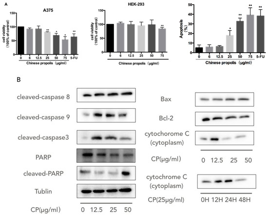 Chinese propolis (CP) exerted a pro-apoptotic effect on human melanoma cells via the mitochondria pathway. (A) The cells (A375, HEK-293) were cultured and incubated with 6 μg/mL, 12.5 μg/mL, 25 μg/mL, 50 μg/mL, 75 μg/mL CP and 50 μM Fluorouracil (5-FU) as a positive control for 48 h and were then analyzed using the cell counting kit-8 (CCK8) assay and Annexin-FITC/PI assay. * p < 0.05 and ** p < 0.005 for the designated treatment versus the control (vehicle); (B) CP induced intrinsic apoptosis and changes in the expression of Bax and Bcl-2. After treatment with CP for 48 h, the expression of apoptosis related proteins including the caspase family and mitochondria-related proteins were analyzed by Western blot.