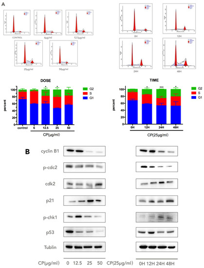 Cell cycle control is implemented through a series of checkpoints [43]. To understand how CP interrupts the cell cycle progression, we next examined the expressions of the cell cycle-related proteins cyclinB1, p-cdc-2, cdk-2, p21, and p-chk-1 (Figure 2B). After 48 h treatment with CP, the expression level of cdk-2 was upregulated, while p-cdc-2 and cyclinB1 had decreased. p21 was over-expressed after treatment of CP. The alterations of protein expression were observed at 12 h, with a corresponding increase in the G2/M phase in flow cytometry results. In addition, p53 was found to be downregulated after CP treatment.