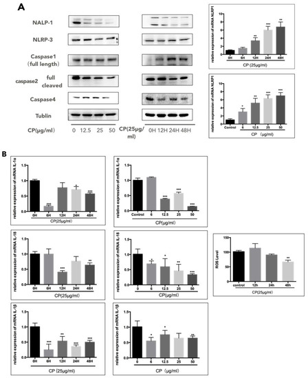 Inflammation has long been recognized to be closely associated with various types of cancer, especially with melanoma [8,9,15]. Interestingly, we found that NLRP1 responded significantly to CP treatment, while NLRP3 expression was not influenced obviously (Figure 3A). On the other hand, the mRNA level of NLRP1 was not consistent with the protein level and increased after CP treatment. In our study, the expression of the full-length form of caspase-1 increased, while the full-length form of caspase-2 subsequently decreased, revealing suppression of caspase-1 and activation of capase-2. Upon activation, the NLRs are known to cleave the caspase-1, which results in the activation of IL-1β [44]. Thus, we analyzed the mRNA levels of IL-1β, IL-1α and IL-18 and found a significant decline after CP treatment, indicating the suppression of the inflammatory pathway (Figure 3B). Furthermore, the ROS level was significantly decreased after being treated with 25 μg/mL CP for 48 h (Figure 3B).