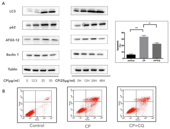 Autophagy has been recognized as a tumor survival mechanism that reacts to external stimuli like antitumor drugs [16,18,45]. We examined the hallmarks of autophagy, including LC3, p62, beclin1, and Atg5/Atg12, to see if autophagy responded to CP treatment (Figure 4A). After being treated with CP for 48 h, the ratio of LC3-I/LC3-II decreased notably, while the Atg5/Atg12 complex and p62 increased, suggesting the activation of autophagy. Also, we found a down-regulation of beclin1 in CP-treated cells. To determine the role that autophagy played in CP-induced apoptosis, we applied CQ, an autophagy inhibitor, on CP-treated cells. Results showed that the apoptosis rate decreased significantly after co-treatment with CQ and CP in comparison with the CP-treated-only group (Figure 4B), indicating that autophagy partly contributed to the pro-apoptotic effect of CP on melanoma.
