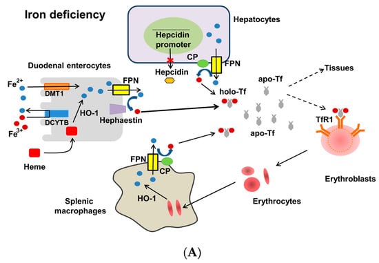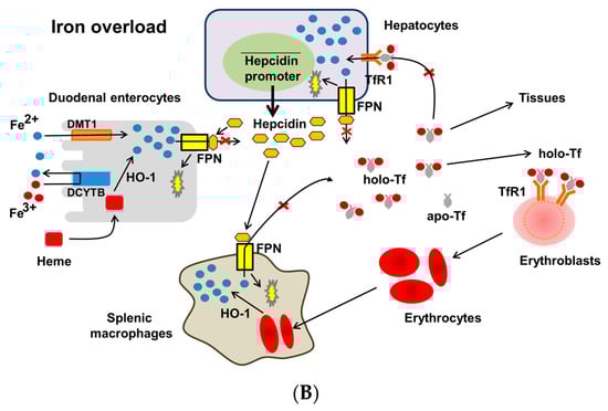 Regulation of systemic iron homeostasis. Divalent metal transporter 1 (DMT1) at the apical membrane of enterocytes takes up Fe2+ from the lumen after duodenal cytochrome b (DCYTB) reduces dietary Fe3+ to Fe2+. Ferroportin (FPN) at the basolateral membrane exports Fe2+ into the circulation. FPN cooperates with hephaestin that oxidizes Fe2+ to Fe3+. In hepatocytes and macrophages, Fe2+ is oxidized by a ferroxidase, ceruloplasmin (CP). Diferric (Fe3+2) transferrin (holo-Tf) supplies iron to all cells and tissues through binding to Tf receptor 1 (TfR1) and endocytosis. Erythrocytes are phagocytized by macrophages. Hemoglobin-derived heme in enterocytes and macrophages is catabolized by heme oxygenase-1 (HO-1). After sensing iron, hepatocytes produce and release hepcidin. In iron deficiency (A), low hepcidin facilitates iron export by FPN into the circulation. In iron overload (B), high hepcidin binds to FPN and inhibits iron export from enterocytes, hepatocytes and macrophages by triggering internalization and degradation of FPN, leading to reduction of iron storage. Dashed line indicates less iron supply. x: inhibition. Figures adapted from [12].