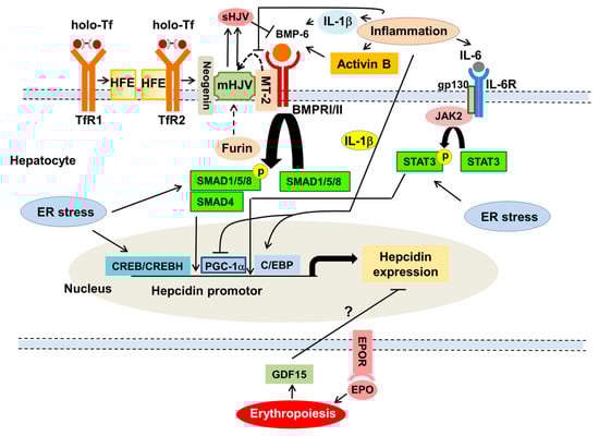 Pro-inflammatory cytokines are increased in CKD [17,18]. Pro-inflammatory cytokines such as IL-1β and IL-6 stimulate hepcidin expression via the Janus kinase (JAK)/signal transducer and activator of transcription 3 (STAT3) pathways [10,11,12,28] (Figure 2). Inflammation induces other cytokine activin B which stimulates BMP-6/SMAD pathway synergically with IL-6 and STAT3, leading to hepcidin expression [11]. Endoplasmic reticulum (ER) stress associated with inflammation increases hepcidin by activating SMAD1/5/8 [33], IL-6-dependent phosphorylated STAT3 [34] and ER stress-activated transcription factor, cyclic AMP response element–binding protein H (CREBH), which bind and activate hepcidin promoter activity [35]. Inflammation inhibits MT-2 by suppressing STAT5 [36] and peroxisome proliferator-activated receptor γ coactivator-1α (PGC-1α) which antagonizes LPS-induced hepcidin transcription via the interaction with hepatocyte nuclear factor 4α [37], leading to activation of hepcidin translation. Inflammation-induced IL-1β also activates hepcidin expression by inducing CCAAT enhancer-binding protein (C/EBP)δ in hepatocytes [38].