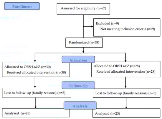Fifty-eight children were randomly allocated to receive either ORS+Lr&Z (n = 30) or ORS−Lr&Z (n = 28) seven of whom (two from the ORS+Lr&Z and five from the ORS-Lr&Z group) were lost from follow up. A total of 51 children mean ± SD age 1.8 ± 0.7, 1.7 (1.3, 2.3), 37 males, 14 females, received either ORS+Lr&Z (n = 28, aged 1.7 ± 0.7, 21 males, seven females) or ORS−Lr&Z (n = 23, mean ± SD age 1.8 ± 0.7, 16 males, seven females) and were included in the analysis. The CONSORT flow diagram of the study is shown in Figure 1.