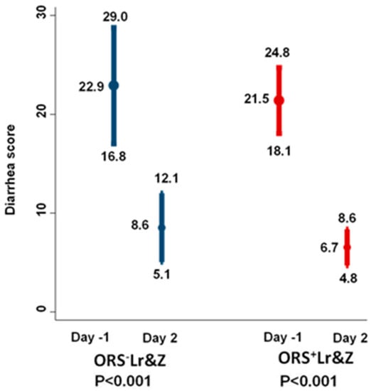 Improvement of the severity score of diarrhoea at day 2 compared to baseline (day−1). At each time point, the results are presented with means and 95% confidence intervals. Comparisons within groups were performed by the Wilcoxon signed-rank test for paired data, whereas data between groups were compared by the Mann-Whitney U test. Comparisons in the ORS+Lr&Z arm on day two versus day−1 (p < 0.001). Comparisons in the ORS−Lr&Z arm on day two versus day−1 (p < 0.001).