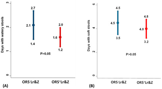 (A): Number of days with watery stools. (B): Number of days with soft stools. Results are presented with means and 95% confidence intervals. Comparisons between the ORS+Lr&Z and the ORS-Lr&Z arms were performed by the Mann-Whitney U test (p > 0.5).