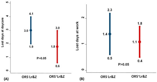 (A): Number of lost day care/nursery days for patients. (B): Number of lost work days for parents. Results are presented with means and 95% confidence intervals. Comparisons between the ORS+Lr&Z and the ORS-Lr&Z arms were performed by the Mann-Whitney U test (p > 0.5).
