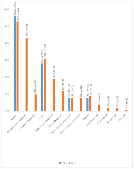 The proportion of participants using various vegetable oils for cooking purposes in the Yangon region between 2014 and 2016.