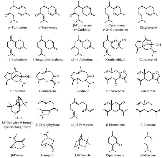 Generally, essential oils of Curcuma species are obtained by hydro- or steam distillation of the fresh or dry rhizome []. Alternatively, Curcuma volatiles have also been obtained by solvent extraction or supercritical fluid extraction of the powdered rhizome []. More recently, solid-phase microextraction (SPME) has been employed as a solvent-free technique to capture and concentrate volatiles from different plant parts. Industrially, Curcuma oil is produced during oleoresin processing as a byproduct of curcumin extraction []. After curcumin is isolated from the oleoresin, the mother liquor (about 70–80%) is known as “curcumin-removed turmeric oleoresin” (CRTO) []. The oil is then extracted from CRTO by hexane or other organic solvent, a process that could result in the loss of the highly volatile components during solvent evaporation []. The use of alcohols as the solvent for oil extraction might cause esterification, etherification, and acetal formation []. The volatile components of different Curcuma species, typically identified by gas chromatography mass spectrometry, are summarized in Table 1. In general, Curcuma species produce a wide variety of volatile sesquiterpenes, monoterpenes, and other aromatic compounds [,]. The chemical structures of key volatile components are presented in Figure 1. There is a tremendous variation in the composition of Curcuma essential oils (EOs). Differences in the oil chemical profile might be due to genotype, variety, differential geography, climate, season, cultivation practices, fertilizer application, stress during growth or maturity, harvesting time, stage of maturity, storage, extraction, and analysis methods [,,,]. However, some of the variation could be due to misidentification of the plant species or some of the components.