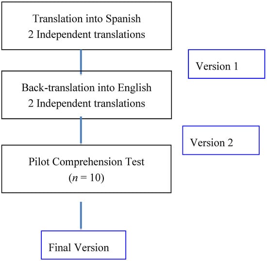 Once the first draft was prepared, an initial test was performed on a random sample (n = 10) to check comprehension, acceptability, language use, and feasibility. The questionnaire was administered in a personal interview by dieticians/nutritionists trained in questionnaire administration. Once the questionnaire was completed by the participants, the objections, modifications, and suggestions considered adequate were recorded and agreed upon by the research team. A final version was obtained by consensus among all researchers. Figure 2 shows the outline of the cross-cultural translation and adaptation process.