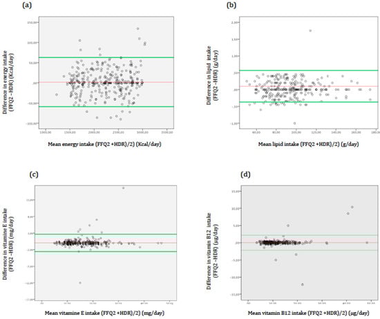 Bland–Altman plots showing the relationship between mean and differences in the daily intake of (a) energy, (b) lipids, (c) vitamin E, and (d) vitamin B12 estimated with the second FFQ (FFQ2) and three 24-HDR and the corresponding mean intake estimated by the two methods.