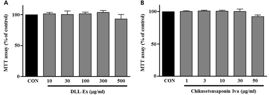 Cytotoxicities of DLL-Ex and CS-IVa were determined using MTT assays. Figure 3 shows that DLL-Ex and CS-IVa had minimal cytotoxic effects up to 500 μg/mL and 50 μg/mL, respectively, in 3T3-L1 cells.