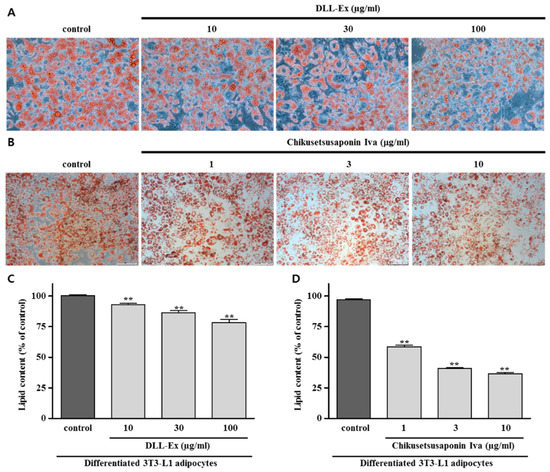 Effects of DLL-Ex and CS-IVa on lipid accumulation in 3T3-L1 adipocytes. (A,C) Inhibitory activity of DLL-Ex on lipid content; (B,D) Inhibitory activity of CS-IVa on lipid content. The results were expressed as mean ± SEM of triplicate experiments. ** p < 0.01.