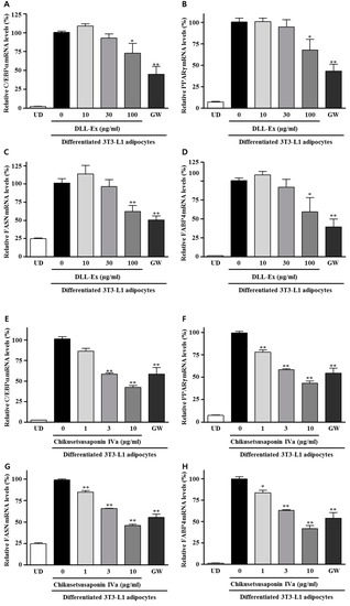 Effects of DLL-Ex and CS-IVa on mRNA expression of differentiation-related transcriptional factors and lipogenic genes in 3T3-L1 adipocytes. (A) Inhibitory activity of DLL-Ex on C/EBPα RNA levels; (B) Inhibitory activity of DLL-Ex on PPARγ RNA levels; (C) Inhibitory activity of DLL-Ex on FASN RNA levels; (D) Inhibitory activity of DLL-Ex on FABP4 RNA levels; (E) Inhibitory activity of DLL-Ex on C/EBPα RNA levels; (F) Inhibitory activity of DLL-Ex on PPARγ RNA levels; (G) Inhibitory activity of DLL-Ex on FASN RNA levels; (H) Inhibitory activity of DLL-Ex on FABP4 RNA levels. The results were expressed as mean ± SEM of triplicate experiments. ** p < 0.01, * p < 0.05. UD: Undifferentiated 3T3-L1 cells.