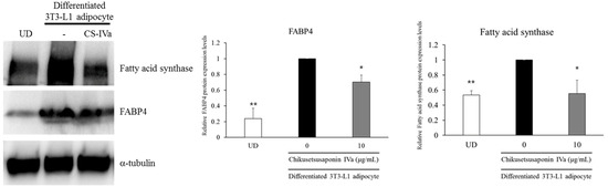 Effects of CS-IVa on protein expression of lipogenic genes in 3T3-L1 adipocytes. The results were expressed as mean ± SEM of triplicate experiments. ** p < 0.01, * p < 0.05. UD: Undifferentiated 3T3-L1 cells.