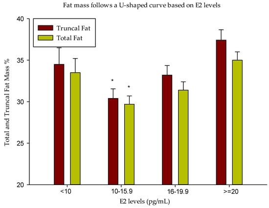 Fat Mass Follows a U-shaped curve based on E2 levels. Total and truncal fat mass (%) were the lowest in group 2. Data are presented as Mean ± Standard Error (SE). * p < 0.05 compared to all other groups.