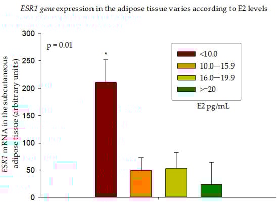 ESR1 gene expression in the adipose tissue varies according to E2 levels. Group 1 (E2 < 10.0) had the highest ESR1 expression compared to all other groups (* p < 0.05). Data are presented as Mean ± SE.