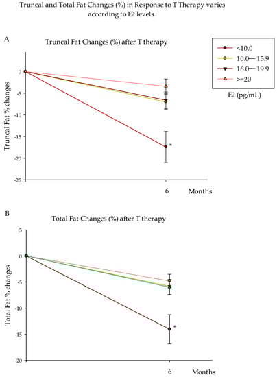 Truncal and Total Fat Changes (%) in Response to T Therapy varies according to E2 levels. Truncal (A) and total (B) fat mass decreased more (% changes) in group 1 (E2 < 10.0 pg/mL) compared to all other groups. Data are presented as Mean ± SE. * p < 0.05 compared to all other groups.