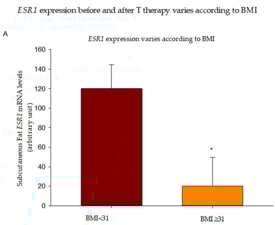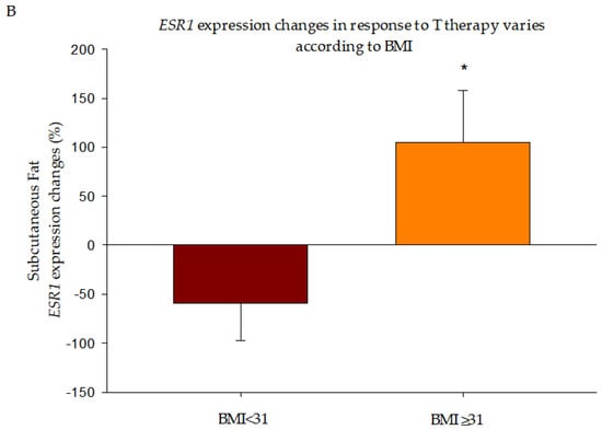 ESR1 expression before and after T therapy varies according to BMI. ESR1 mRNA levels were lower in BMI ≥ 31 (A) but increased more in this group after 6 months of T therapy (B). Data are presented as Mean ± SE. * p < 0.05 compared to BMI < 31.