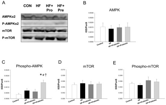 Maternal HF diet and probiotic/prebiotic therapies have no effect on renal protein levels of AMPKα2 (Figure 3B), mTOR (Figure 3D), and phosphorylated mTOR (Figure 3E). Nevertheless, maternal prebiotic therapy significantly increased renal protein level of phosphorylated AMPKα2 in offspring kidneys (Figure 3C).