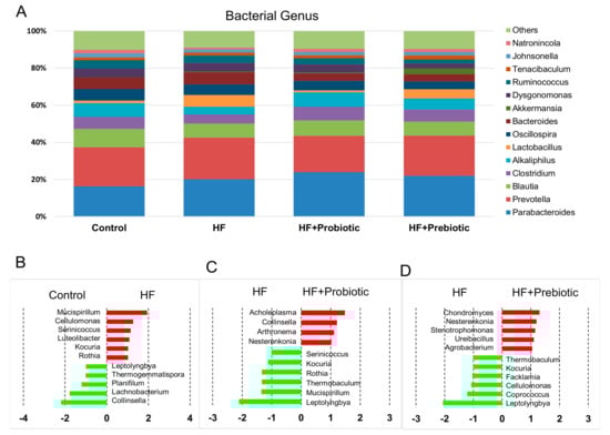 Effect of maternal high-fructose (HF) diet, probiotic Lactobacillus casei, and prebiotic inulin on gene expression of (A) relative abundances of the gut microbiota at the genus level. Linear discriminant analysis (LDA), along with effect size measurements, was applied to identify enriched bacterial genera. Most enriched and depleted genera (LDA score (log10) > 1.0) in the (B) HF (red) vs. control (green), (C) HF+Probiotic (red) vs. HF (green), and (D) HF+Prebiotic (red) vs. HF (green). N = 7–8/group.