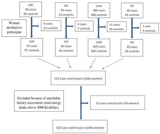 The baseline questionnaire included a semi-quantitative food frequency questionnaire (FFQ) with 137 items previously translated, adapted and validated in Spanish women aged 18–74 years. Moreover, the questionnaire included open-label questions for information about the use of dietary supplements during the pregnancy [26]. The final questionnaire has been previously assessed by de la Fuente-Arillaga et al. [27]. The FFQ was based on typical portion sizes and had nine options for the frequency of intake in the previous year for each food item (ranging from never or almost never to ≥6 times/day). A dietitian updated the nutrient data bank using the information recorded in the food composition tables for Spain [28,29]. Nutrient scores were computed using ad hoc computer software specifically developed for this purpose (frequency and nutrient composition of specified portion size for each food item). After computing total energy intake, 15 matched pairs were excluded because of unreliable dietary assessment (total energy intake above 4000 kcal/day), leaving 518 pairs for analysis.