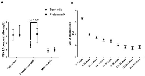 Recent literature has shown that concentrations of Lf in milk vary widely [11,12,13]. Both maternal and infant factors may affect the concentration of Lf in human milk. Milk Lf concentrations are consistently highest in colostrum and then decrease gradually. However, it is unclear whether geographic location, ethnicity, maternal age, parity, socioeconomic status, nutritional status, infant infections, prematurity, and type of delivery are associated with the concentration of Lf in breast milk.