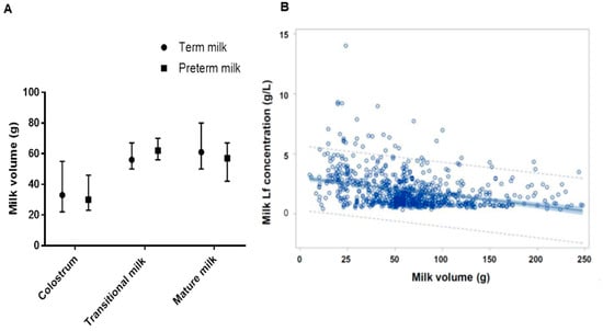 After controlling for geographic area and ethnicity, various maternal factors that might potentially affect Lf concentrations were analyzed. The expressed volume of term and preterm milk from one breast was similar at each stage of lactation (Figure 2A). Lf concentration was negatively associated with the expressed volume of milk; for every 50 g increase in the amount of milk expressed from one breast, the Lf concentration decreased by 0.15 g/L (p = 0.014) (Figure 2B). Lf concentrations at 0–7 days, 8–10 days, or 11–13 days were significantly greater than the one after 31 days. Maternal BMI (p = 0.36), age (p = 0.28), mode of delivery (p = 0.27), and parity (p = 0.16) were not significantly correlated with milk Lf concentration. Amounts of milk, meat, or soy source protein intake were not significantly correlated with milk Lf concentration. Neither was maternal serum albumin concentration (46.2 ± 2.7 g/L) significantly correlated with the milk Lf concentration (p = 0.94), suggesting that nutritional status of mothers as assessed by these biomarkers did not affect milk Lf concentration. However, maternal serum ferritin concentration (median (P25, P75): 19.3 μg/L (8.9 μg/L, 38 μg/L)) was negatively associated with milk Lf concentration (beta = −0.19 mg/100 g, n = 206, p = 0.047), indicating that milk Lf concentration may be associated with maternal iron status.