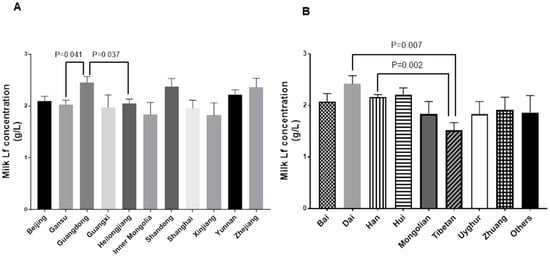 After controlling for stage of lactation time and volume of breast milk expressed, the Lf concentration was significantly greater in milk from Guangdong mothers than in milk from Heilongjiang and Gansu mothers (overall p = 0.02, Guangdong (1.91 g/L) vs. Heilongjiang (1.44 g/L), p = 0.037; Guangdong (1.91 g/L) vs. Gansu (1.43 g/L) p = 0.041; Figure 3A). Further, after controlling for the stage of lactation and volume of breast milk pumped out, Lf concentration was significantly greater in milk from mothers of Dai and Han ethnicity mothers than in milk from mothers of Tibetan ethnicity (overall p = 0.01, Dai (1.80 g/L) vs. Tibetan (0.99 g/L), p = 0.007; Han (1.62 g/L) vs. Tibetan (0.99 g/L), p = 0.002, Figure 3B).