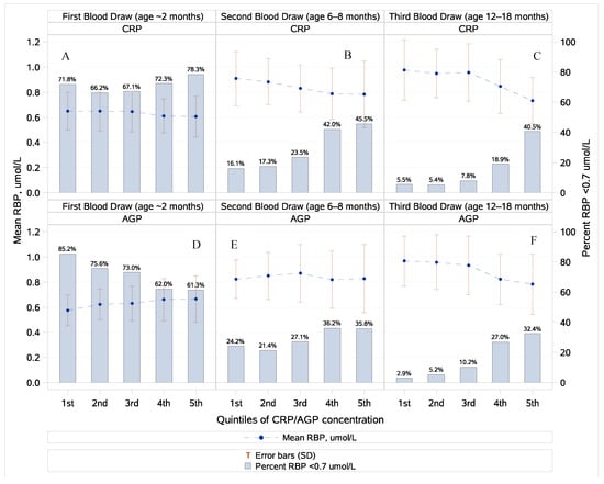 Prevalence of infant vitamin A deficiency (VAD; RBP < 0.70 µmol/L) and mean RBP by quintiles of the C-reactive protein (CRP) and the alpha(1)-acid glycoprotein (AGP) and by blood draw. Panels (A–C) show VAD by CRP quintiles for blood drawn at ~2, 6–8, and 12–18 months, respectively. Panels (D–F) show VAD by AGP quintiles for the same time periods. The prevalence of VAD was not significantly different (Cochran Armitage trend test, p = 0.23) by CRP quintile for infants measured at the first blood draw (~2 months of age, panel (A)) even though VAD seemed to decrease slightly by the AGP quintile at the first blood draw (Cochran Armitage trend test, p = 0.0001, panel (D)). However, prevalence of VAD significantly increased by CRP and AGP quintile for infants at the second and third blood draws (6–8 and 12–18 months of age).