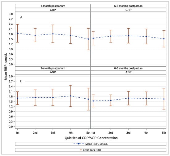 In mothers, no clear relationship was observed between retinol and inflammation. There was a small but significant negative relationship of RBP and CRP at the first postpartum visit (β = −0.1, p < 0.0001), but RBP was otherwise not significantly associated with inflammation in mothers. There was no relationship between the RBP and the APP quintile (Figure 2).