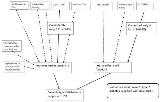 Current guidelines for the prevention of type 2 diabetes (T2D) in people at high risk are based around achieving moderate weight loss (3–7% weight loss) via dietary change and increasing physical activity []. In each of the major diabetes prevention trials (Table 1), dietary advice (for those categorised as overweight) was to lower fat intake to achieve a modest calorie deficit, and to increase physical activity [,,,,]. Other dietary changes in some trials included increasing fibre and limiting intake of saturated fat and added sugar [,].