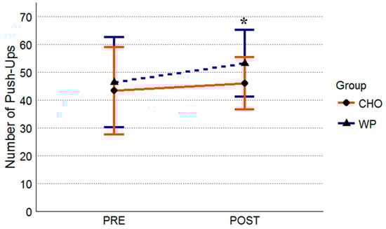 Push-up Performance. All data are presented as means ± standard deviation values. Abbreviations: WP, whey protein group (n = 34); CHO, carbohydrate-placebo group (n = 35). Symbols: *, indicates WP > CHO at POST.