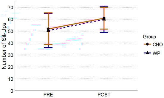 Sit-up Performance. All data are presented as means ± standard deviation values. Abbreviations: WP, whey protein group (n = 34); CHO, carbohydrate-placebo group (n = 35).