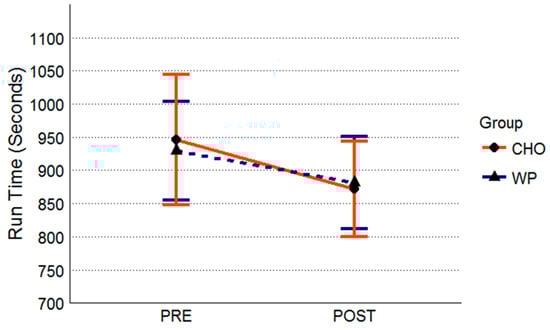 After controlling for initial run performance there was no significant group difference at post-intervention (F = 3.64, p = 0.06). There was no significant initial run by group interaction (F = 2.89, p = 0.09). Post-intervention run performance was 14:41 (minutes:seconds) ± 1:9 in the WP group and 14:32 (minutes:seconds) ± 1:11 in the CHO group (Figure 4). Effect sizes and mean differences for run performance are summarized in Table 3.