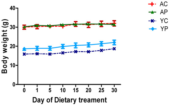 Effect of DDS-1 supplementation on body weights among the four groups. (YC) Young control group, (YP) young probiotic group, (AC) aging control group, (AP) aging probiotic group.