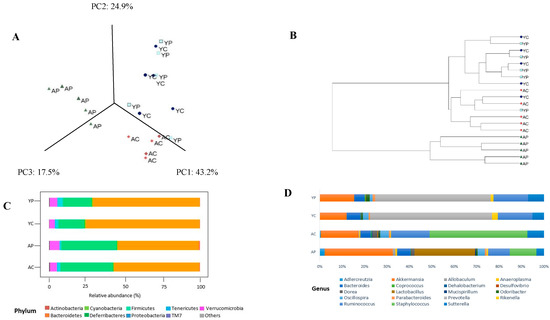 The gut microbiota changes observed in young control group (YC), young probiotic group (YP), aging control group (AC), aging probiotic group (AP) differentiated by principal coordinate analysis (PCoA) (A) and UPMGA dendrogram (B). The gut microbiota composition profiles at phylum (C) and genus levels (D) in control and probiotic-treated group, revealed by 16S rRNA gene sequencing (each color represents bacterial phylum and/or genus).